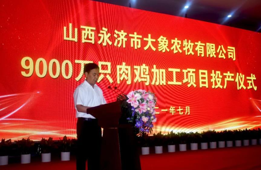 7月的蒲坂大地,树木郁郁葱葱,万物勃发。2021年7月21日,山西永济市大象农牧有限公司9000万只肉鸡加工项目正式投产。运城市副市长董旭光,永济市委书记孙中全,市委副书记、市长黄亚平,市委副书记王文选,市人大常委会主任张立功,副市长卫军、麻亚龙,市政协副主席邵文龙出席仪式。山西乐鱼电竞·(中国)官方网站农牧股份有限公司董事长吕锐锋,副总裁刘文革及各公司经理人出席。仪式由麻亚龙主持。