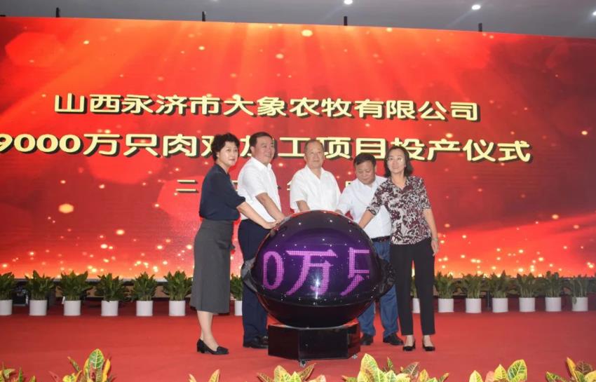 董旭光、孙中全、黄亚平、苏丽红、吕锐锋共同点亮水晶球,宣布山西永济市大象农牧有限公司9000万只肉鸡加工项目正式投产。